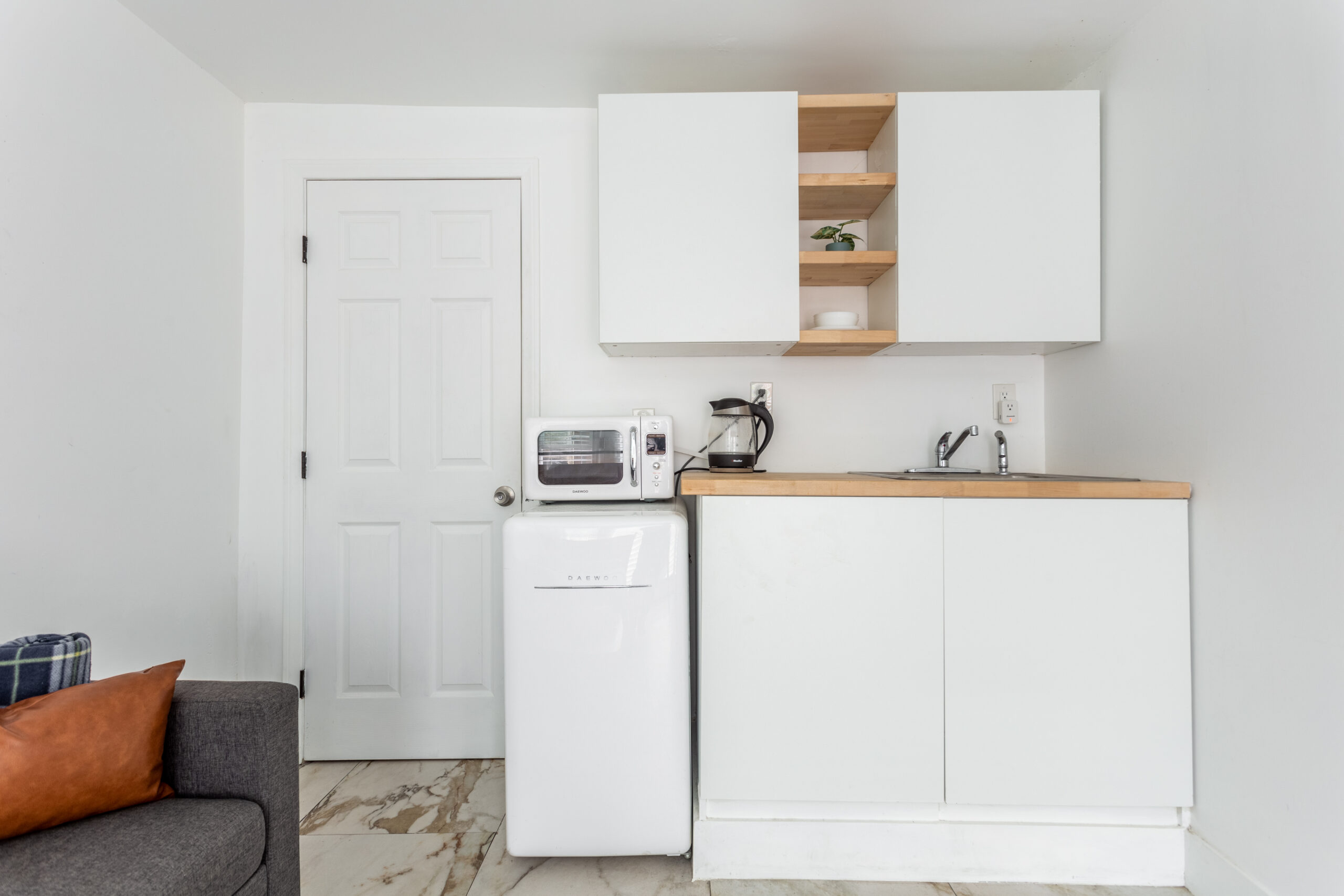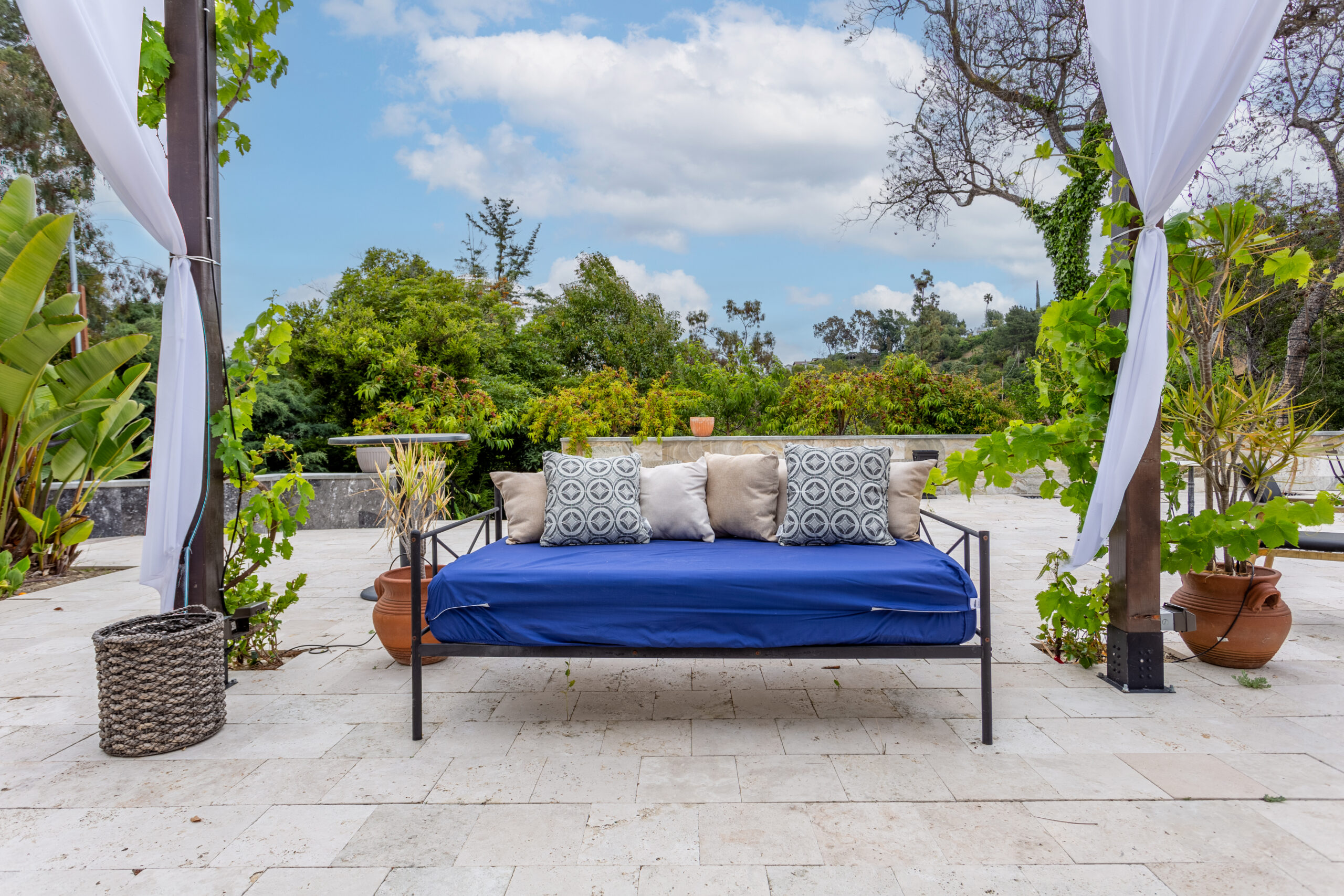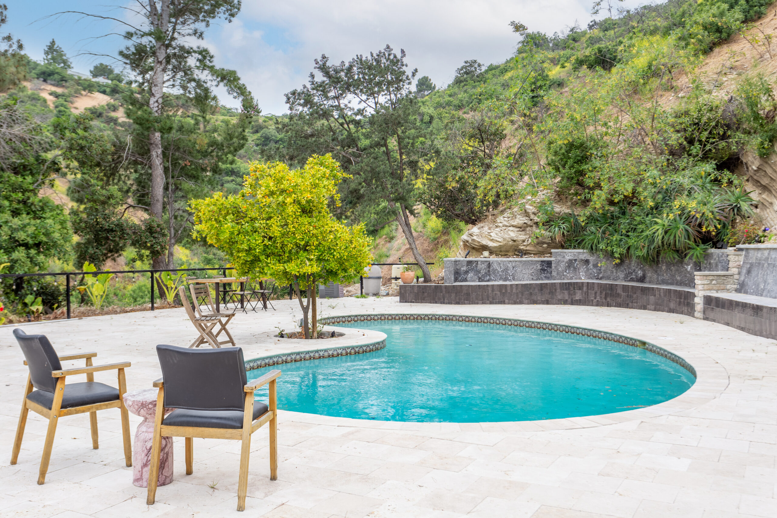 This private, free-standing studio is ideal for a comfortable and tranquil retreat. Fully furnished, the studio includes a queen bed, a sofa with a pull-out queen mattress, a flat-screen TV, and high-speed internet. The kitchenette is equipped with a stainless steel sink, microwave, Keurig, and other essentials, while the elegant French door opens to a peaceful garden view. The marble-tiled bathroom features a walk-in shower, a floating vanity, and a light-up mirror, adding a touch of luxury to the space. Explore garden paths surrounded by fruit trees, including pomegranate, peach, lemon, lime, and kumquat, or relax by the sparkling pool overlooking a serene wildlife reserve. Multiple rills, ponds, and cascading waterfalls enhance the tranquil ambiance, while the 7,500 sqft hardscaped area with imported Turkish travertine, marble, and tile offers space to unwind. Three pergolas furnished with lounge chairs and sofas provide shaded relaxation spots, and a custom 10+-foot outdoor fireplace is perfect for cozy evenings under the stars.The property’s outdoor areas are shared with other separate, unattached units on the expansive 2.5-acre grounds. All utilities are included, covering electricity, water, trash, gas, and high-speed internet. Free street parking is available on a quiet residential road, with a steep driveway leading to paved parking for added convenience. Experience a blend of comfort, style, and natural beauty in this beautifully designed studio.